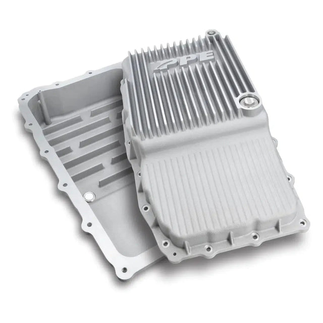 Keep your transmission pan looking clean & running cool; PPE's HD A356.0-T6 cast aluminum transmission pan; featuring thermal heat sinks & external cooling fins, this keeps your transmission fluid running within its ideal viscosity range, helping extend service life.